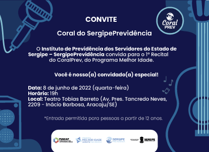 O Instituto de Previdência dos Servidores do Estado de Sergipe (SergipePrevidência) realizará o 1º Recital do CoralPrev, do Programa Melhor Idade, na quarta-feira, 8 de junho, às 19h, no Teatro Tobias Barreto. Resultado da parceria entre o SergipePrevidência e a Fundação de Cultura e Arte Aperipê de Sergipe (Funcap), o Recital visa apresentar o primeiro produto dos Projetos de Coral, Dança e Terapia Psicológica em Grupo. O Recital será direcionado para o público a partir de 12 anos.