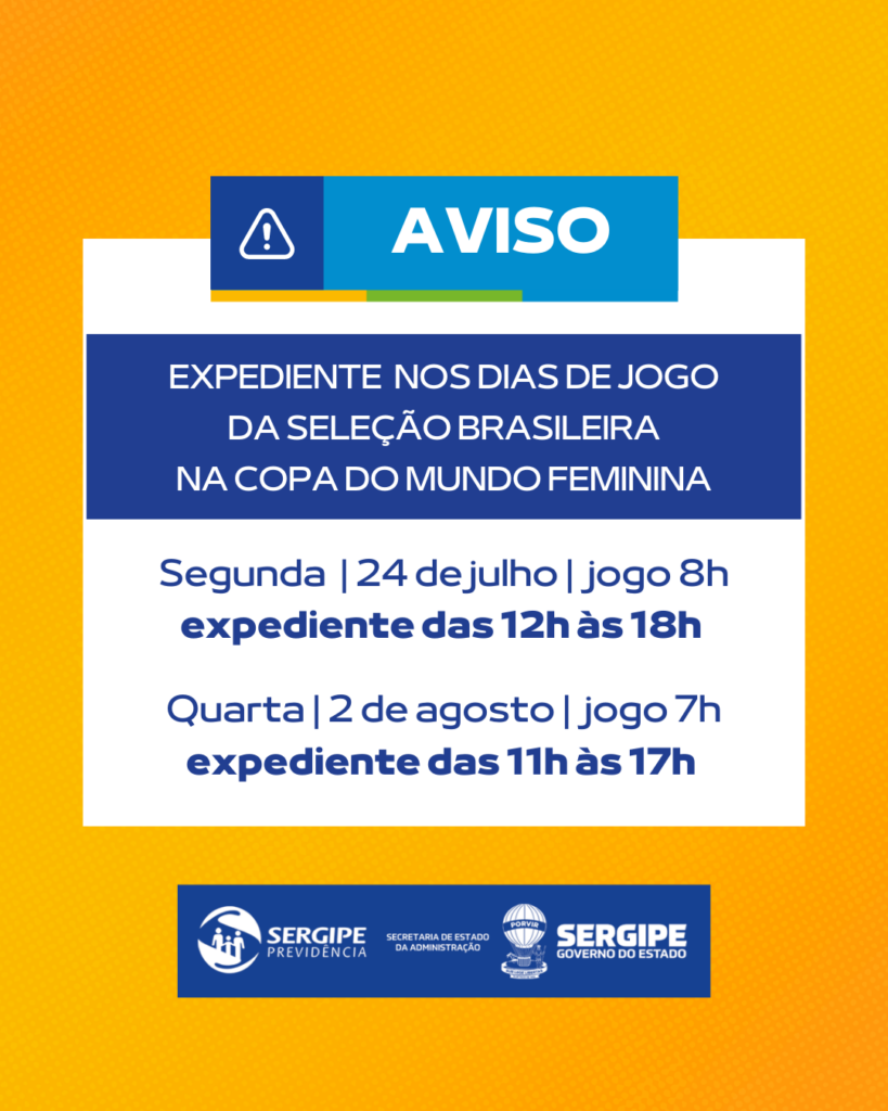 Por meio do Decreto nº 357, de 20 de junho de 2023, o Governo do Estado altera o expediente nas repartições públicas estaduais, nos dias de jogo da Seleção Brasileira de Futebol na Copa do Mundo Feminina da Fifa 2023, que teve início no dia 20 de julho. No caso do SergipePrevidência, na segunda, dia 24 de julho, o funcionamento será das 12h às 18h; e na quarta, 2 de agosto, das 11h às 17h.