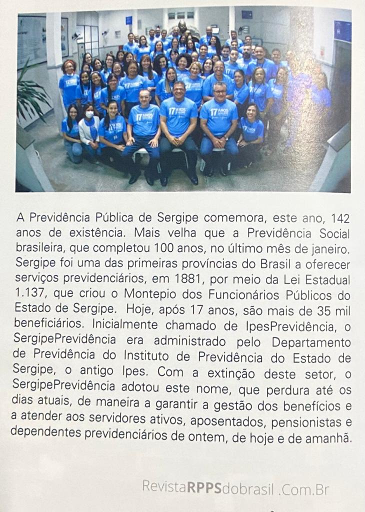 Completado neste ano, o aniversário de 17 anos do SergipePrevidência é destaque na 64ª edição da Revista (impressa) RPPS do Brasil, maior revista nacional de Regime Próprio de Previdência, e único periódico para órgãos previdenciários estaduais e municipais com circulação em todo o país. São dois registros. A reportagem especial, na editoria Destaque, páginas 24 e 25; e a nota, na editoria Curtas, na página 26. Ambos os materiais também foram destaque na versão digital da Revista.